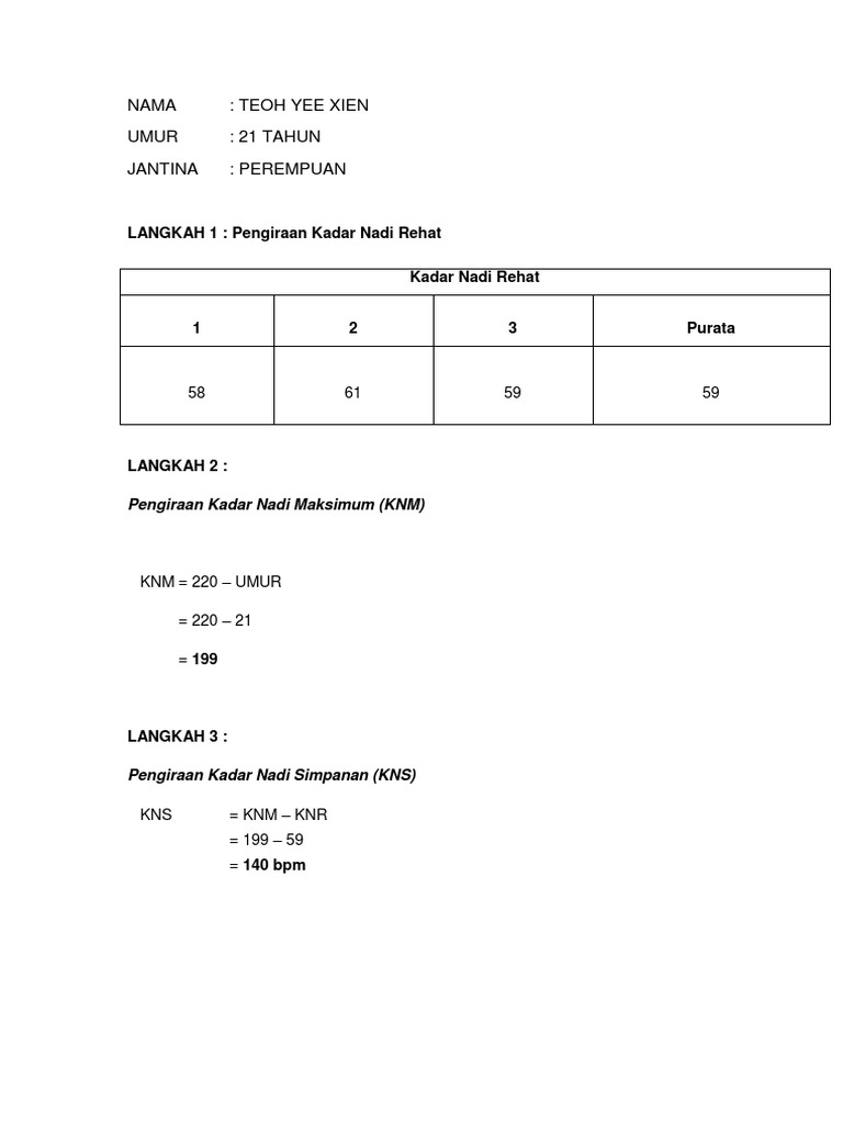 Daya tahan ini terbahagi kepada dua iaitu daya tahan statik dan daya tahan dinamik. Nadi yang tinggi semasa rehat adalah sebab yang serius untuk berfikir tentang kesihatan. Carta kadar nadi rehat bagi seseorang. Berbagai formula yang digunakan untuk menganggarkan knm individu berdasarkan umur, tetapi knm bervariasi secara signifikan antara individu. Kirakan kadar nadi latihan (knl) pada intensiti latihan 60% dan 75%. 3) peserta dibahagikan kepada 2 kumpulan mengikut keperluan. Kadar nadi rehat (knr) iaitu denyutan nadi pada masa tidak melakukan aktiviti. Kepada anda yang umurnya sudah meningkat, harus selalu buat pemeriksaan kesihatan dan memastikan kadar degupan jantung sewaktu rehat adalah baik. Kadar nadi rehat yang rendah bermakna jantung tidak banyak bekerja semasa kita tidur. 60% sasaran kadar nadi latihan ( knl ) a. Denyutan nadi normal antara 60 hingga 100 denyutan seminit, biasanya org yg mempunyai denyutan nadi yg rendah ialah mempunyai kecergasan kardiovaskular yang baik. Semasa senaman, jantung yang tidak terlatih berdegup lebih cepat, tetapi tidak seperti yang cekap seperti dalam. Kadar denyutan normal bagi dewasa secara umum adalah antara 60 hingga 100 kali setiap minit.